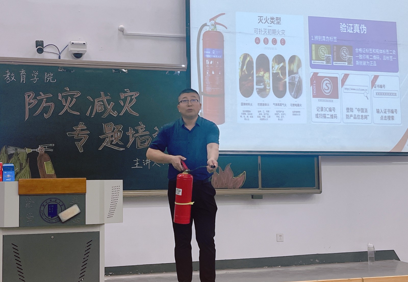 刘泽宁结合近期部分高校典型火灾案例,分析阐述了当前高校常见的消防安全问题。他指出高校校园建筑功能种类多,人员活动密集,消防设施配备和消防专业力量需求较大,学生防灾意识相对淡薄,容易产生火灾隐患,尤其是在宿舍社区内,更容易发生,因此,建设平安校园责任重大。“人人讲安全、个个会应急——着力提升基层防灾避险能力”是今年我国第16个全国防灾减灾日的主题,刘老师针对校园生活常见的消防安全隐患,特逐一向同学们进行危害分析和知识普及,对于发生火灾后的紧急应对,提出了切实可行的防灾减灾策略。在交流互动环节,刘老师现场演示了灭火器的使用方法和常见消防器材的使用注意事项,同学们受益匪浅。
